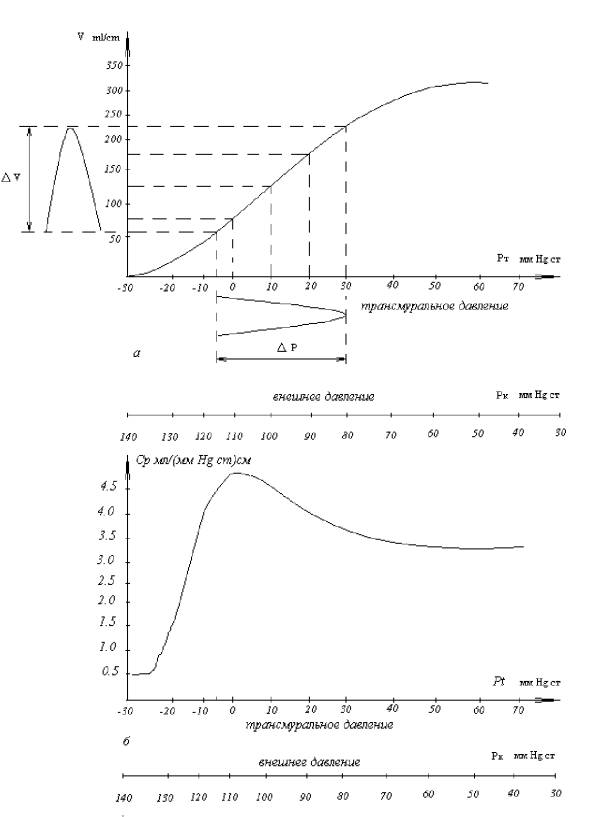Рисунок 1 - Кривая "объём-давление" и зависимость податливости артерии от давления.