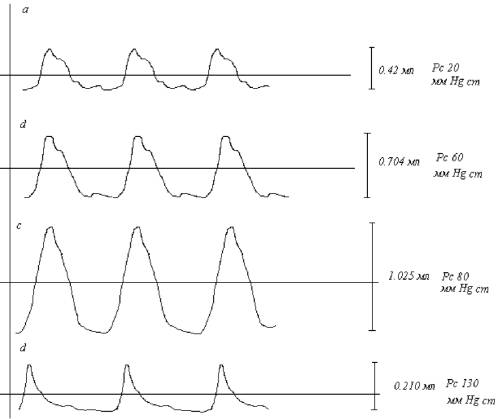 Для этого в месте наложения измерительных электродов вокруг конечности закрепляется окклюзионная манжета. При нагнетании воздуха в манжету кривые изменения объёма артерии имеют вид, показанный на рисунке.