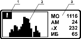 Результаты анализа в первом такте работы - графическое изображение гистограммы и значения вычисленных параметров и показателей отображаются на дисплее прибора.