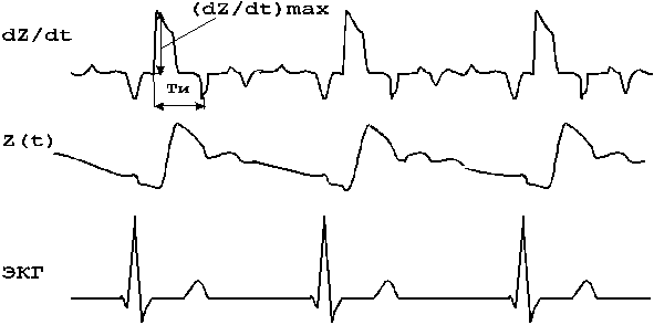 В мониторах сердечного выброса, построенных на импедансном методе, может быть использована стандартная реографическая методика регистрации зависимости изменения сопротивления тканей между измерительными электродами. Компьютерная обработка этой зависимости позволяет в реальном масштабе времени производить вычисление dz/dt, поиск максимума и минимума кривой необходимые для определения данных, входящих в выражение для СО (рис.26).