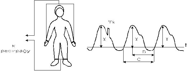 Запись кривой ИРГТ напоминает по форме сфигмограмму, на которой легко выделяются анакротическая и катакротическая части. Для расчета СО необходимо определение характерных точек кривой, по которым находят расстояние между моментами начала фаз быстрого изгнания соседних комплексов (С), равное длительности сердечного цикла, длительность катакротической части реограммы (Д), максимальную амплитуду реограммы (у) (рис.27).