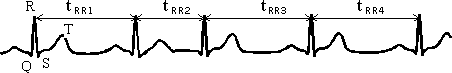 К методам временного анализа сердечного ритма относится вариационная пульсометрия, используемая в различных областях медицины с целью диагностики состояния человека / 17,19,20 /. Методика основана на применении статистических оценок выборки динамического ряда значений длительностей КИ. Использование в качестве КИ - R-R интервалов ЭКГ, зарегистрированных в одном из стандартных отведений, позволяет наиболее точно измерить значения длительностей КИ - tRR (рис.4).