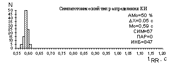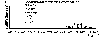 Индекс активности парасимпатического отдела ВНС - ПАР характеризует степень отклонения зарегистрированного распределения КИ от нормального закона распределения / 33 /. Чем больше отклонений от нормального распределения, характеризующегося плавным убыванием количества КИ влево и вправо относительно моды распределения, тем сильнее активность вагусного влияния на регуляцию ритма сердца.