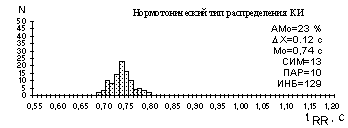 При наблюдении гистограммы распределения КИ можно выделить, по крайней мере, три ее основных типа, качественно и количественно характеризующих три основных состояния регуляторных систем: нормотоническое, симпатотоническое, парасимпатотоническое, которые имеют различные статистические характеристики (рис.6).