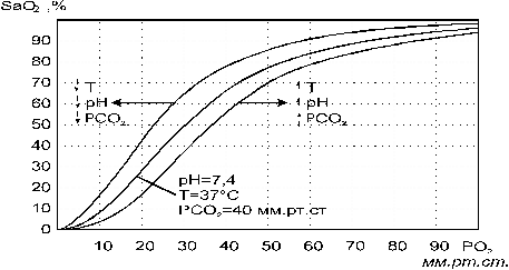 При РО2 <40 мм рт.ст. способность гемоглобина связывать О2 резко падает. В этом случае диссоциация облегчается, что характерно для процессов в тканях организма, активно потребляющих О2. В капиллярах это явление усиливается из-за увеличения напряжения СО2, что еще более облегчает отдачу О2 тканям.