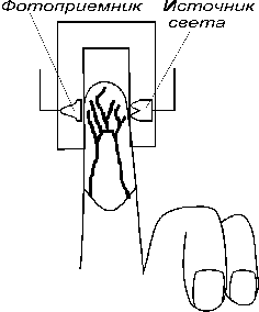 Датчик пальцевого типа (рис.56) представляет собой зажим, состоящий из двух подвижных элементов 1 и 2, скрепленных осью 3, фиксируемый на пальце пружиной 4. В элементе 1 установлены излучатели света, а в элементе 2 - фотоприемник, покрытый выпуклой линзой. |
