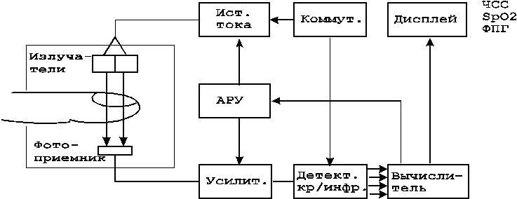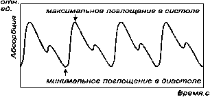 Попытки непосредственного использования методики спектрофотометрии для построения мониторных приборов неинвазивного чрескожного измерения сатурации артериальной крови кислородом не привели к успеху из-за неустойчивости показаний таких приборов / 84 /. Это связано с тем, что при спектрофотометрии тканей, содержащих кровеносные сосуды (например, при просвечивании ушной раковины), не удается дифференцировать артериальный и венозный гемоглобин. Сильное влияние на результаты измерения сатурации абсорбционных свойств кожи и подлежащих тканей приводит к необходимости индивидуальной калибровки таких приборов для каждого пациента.