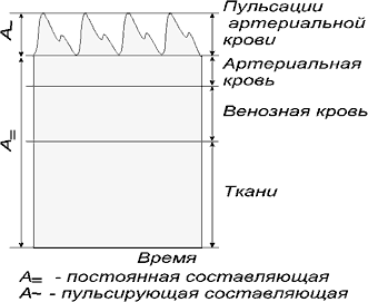 Для неинвазивного определения оксигенации крови в “поле зрения” фотоплетизмографического датчика помещается участок тканей, содержащий артериальные сосуды. В этом случае сигнал с выхода датчика, пропорциональный абсорбции света, проходящего через ткани, включает две составляющие: пульсирующую компоненту, обусловленную изменением объема артериальной крови при каждом сердечном сокращении, и постоянную “базовую” составляющую, определяемую оптическими свойствами кожи, венозной и капиллярной крови и других тканей исследуемого участка (рис.43).
