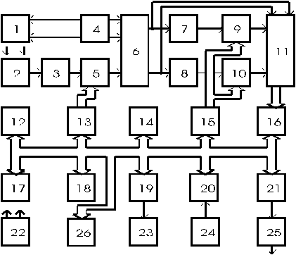 С выхода фильтров пульсирующая составляющая напряжения, пропорциональная пульсовой волне, через регулируемые усилители 9, 10 поступает на АЦП 11. После преобразования в цифровую форму постоянные и пульсирующие составляющие вводятся в микропроцессорное устройство через порт ввода 16. Микропроцессорное устройство содержит центральный процессор 12, работающий под управлением программы, размещенной в ПЗУ 18, а также ОЗУ 17, графический дисплей со встроенным контроллером 26 и ряд периферийных устройств. Порты вывода 13, 15 служат для установки коэффициентов усиления регулируемых усилителей. Таймер 14 формирует временные интервалы для тактирования АЦП, а также для формирования звуковых сигналов.