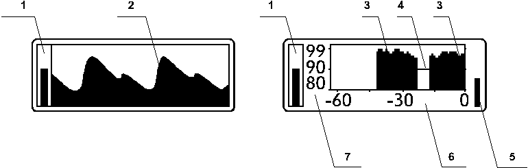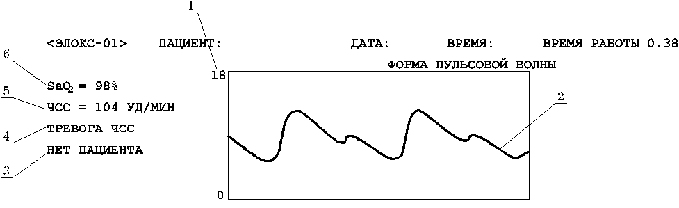 Изображение фотоплетизмограммы 2 снабжено шкалой 1 (в условных единицах), дающей представление об амплитуде пульсовой волны. Значения SpO2 6 и ЧСС 5 фиксируются в момент запуска печати. В поле 4 отображается состояние тревожной сигнализации и наименование параметра, вызвавшего ее срабатывание. В поле 3 дублируются сообщения, выдаваемые на экран прибора.