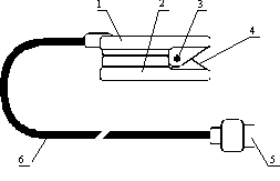 Ногтевая фаланга пальца фиксируется в датчике между элементами 1 и 2 таким образом, что ноготь оказывается обращенным к излучателям. Датчик подключается к прибору с помощью кабеля 6 с разъемом 5.